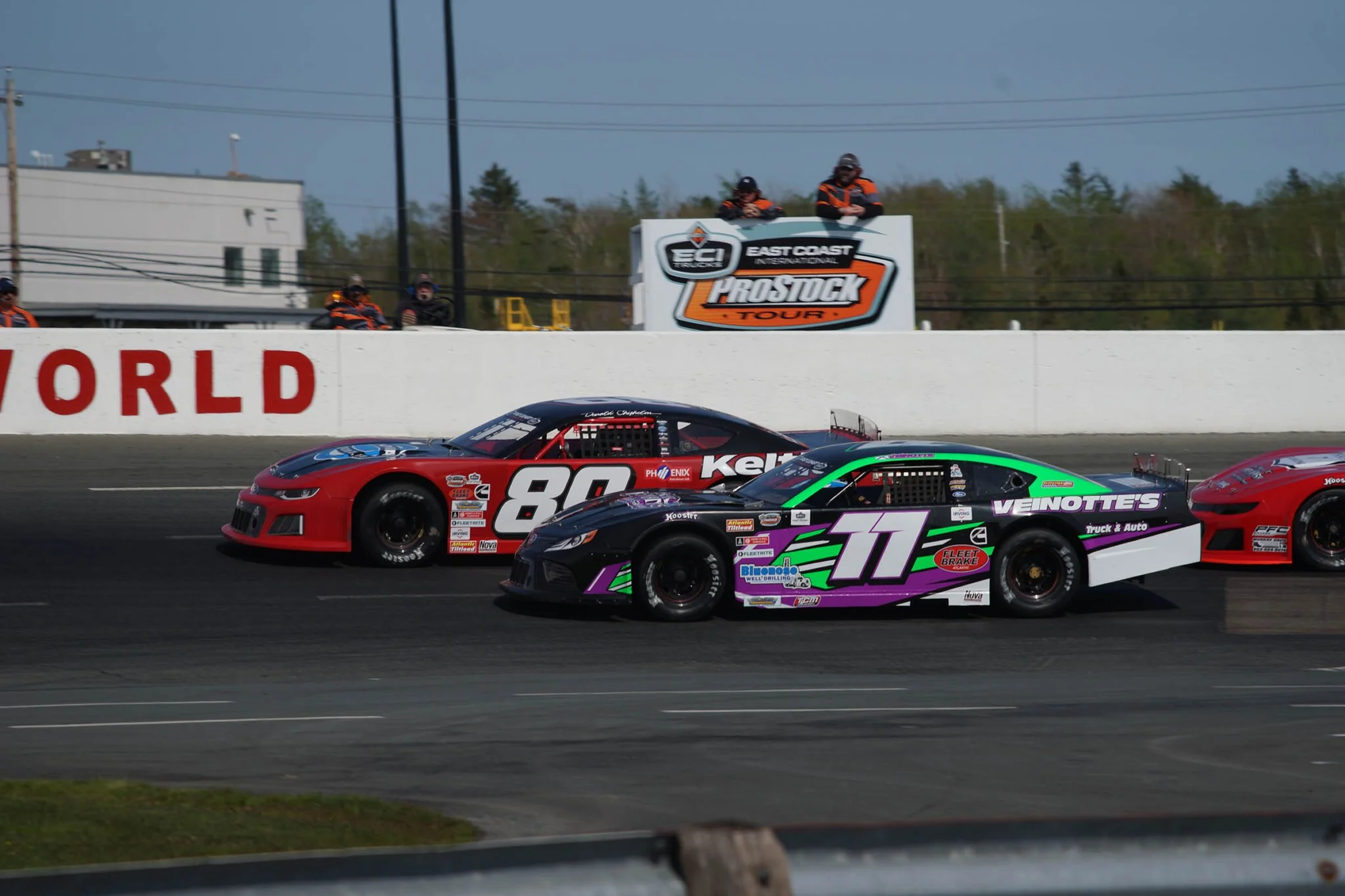 #99 Craig Slaunwhite, the Pro Stock Tour's points leader, audaciously accepted the Scott Fraser Challenge, a nod to his Fraser Racing heritage, upon being asked by Darrin Butcher: 'What would Scott Fraser do? I know you know the answer to that'. Agreeing to start from the back, he was enticed by a special reward for a potential victory and to honour the memory of Fraser. Simultaneously, the highly-regarded Maritime Late Model driver, Dylan Blenkhorn, made his awaited season debut. During pace laps, he had an unexpected pit return, possibly for a radio glitch, putting him at the back, inadvertently handing Slaunwhite his first pass.
